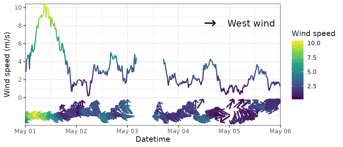 The ggplot2 plotting system is not very good at plotting wind time series where the length of the arrow refers to the wind speed; we will always have the need to plot wind time series.