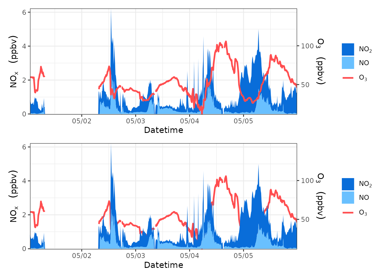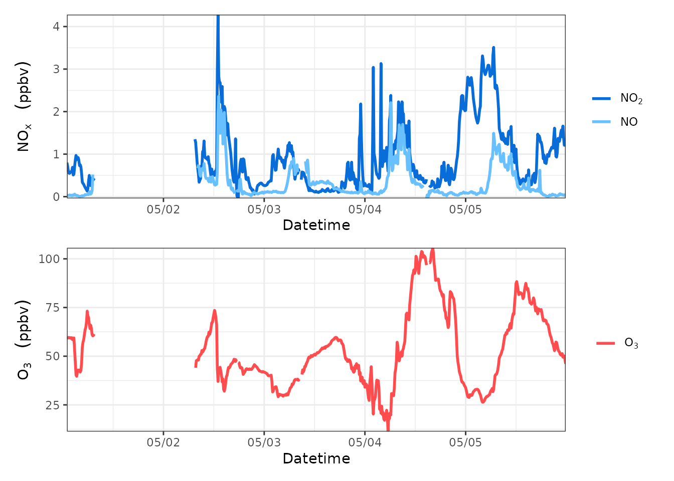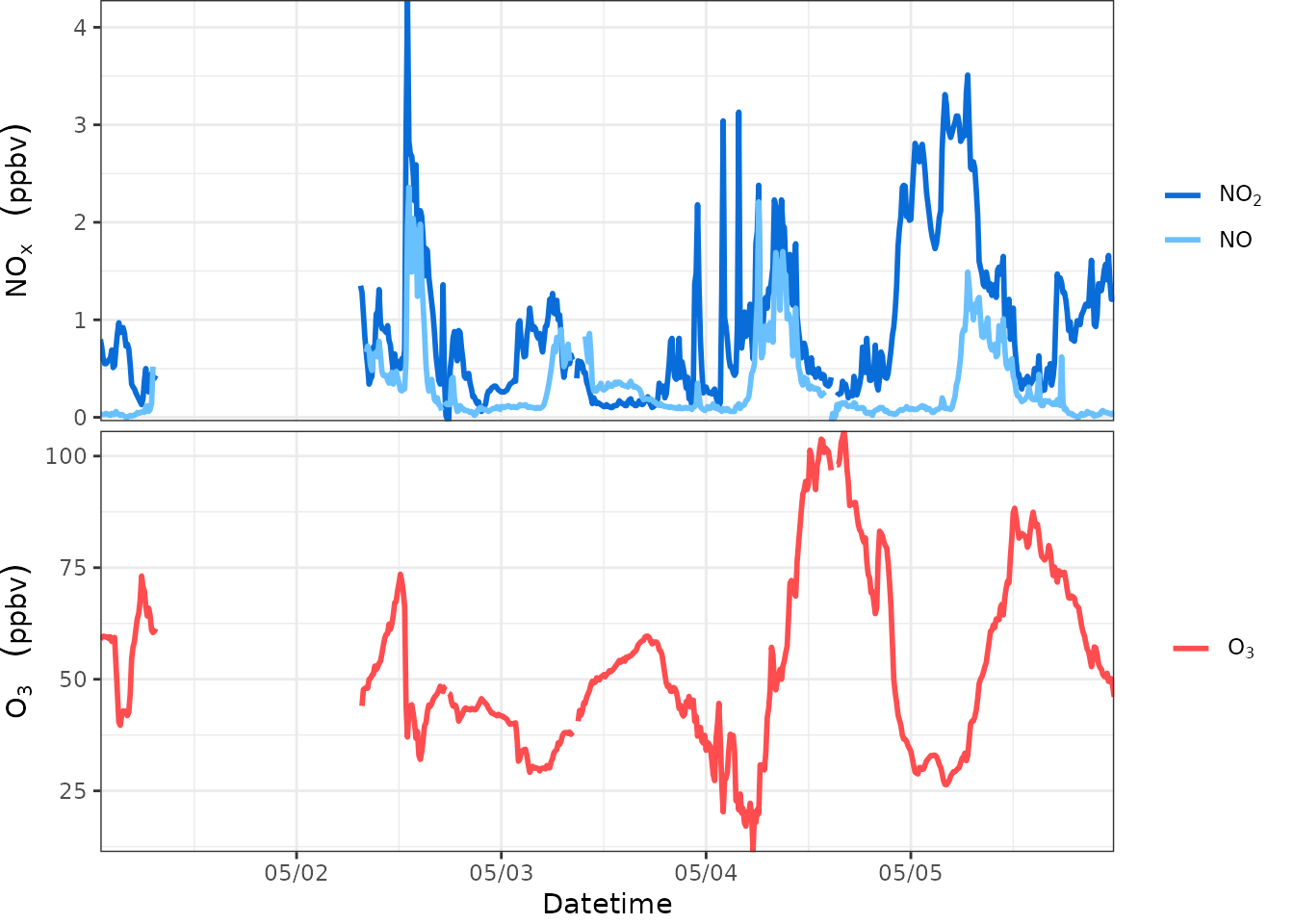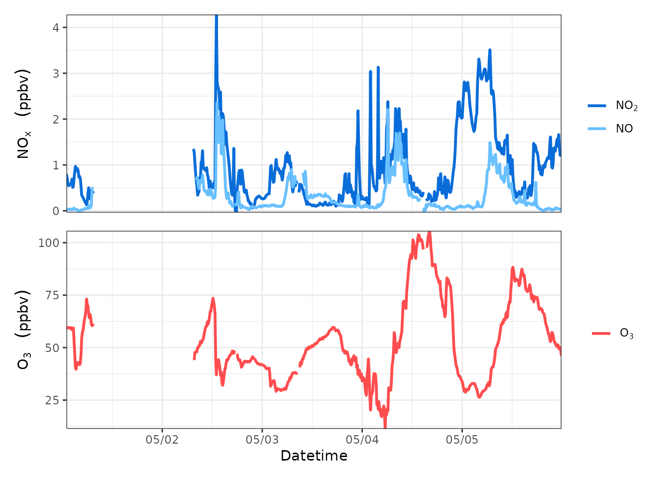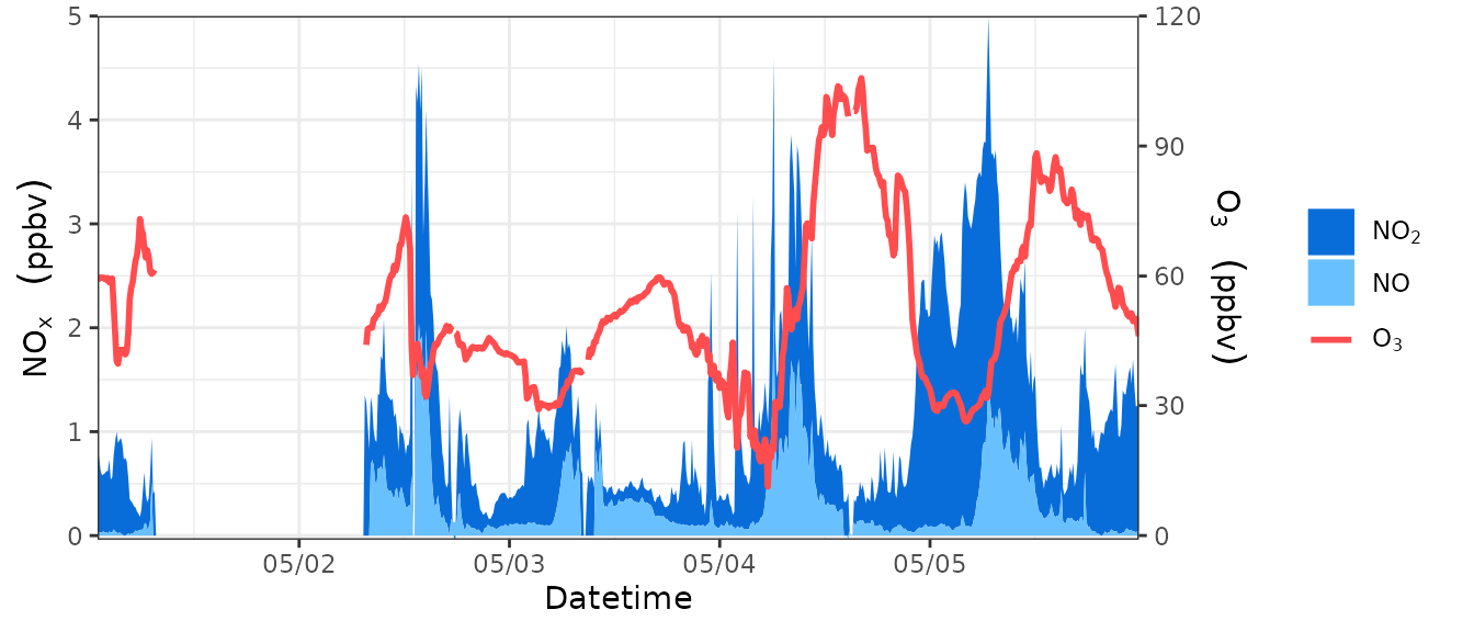 yllab=bquote(NO[x]~" "~(ppbv)), yrlab=bquote(O[3]~" "~(ppbv)), xlab="Datetime",