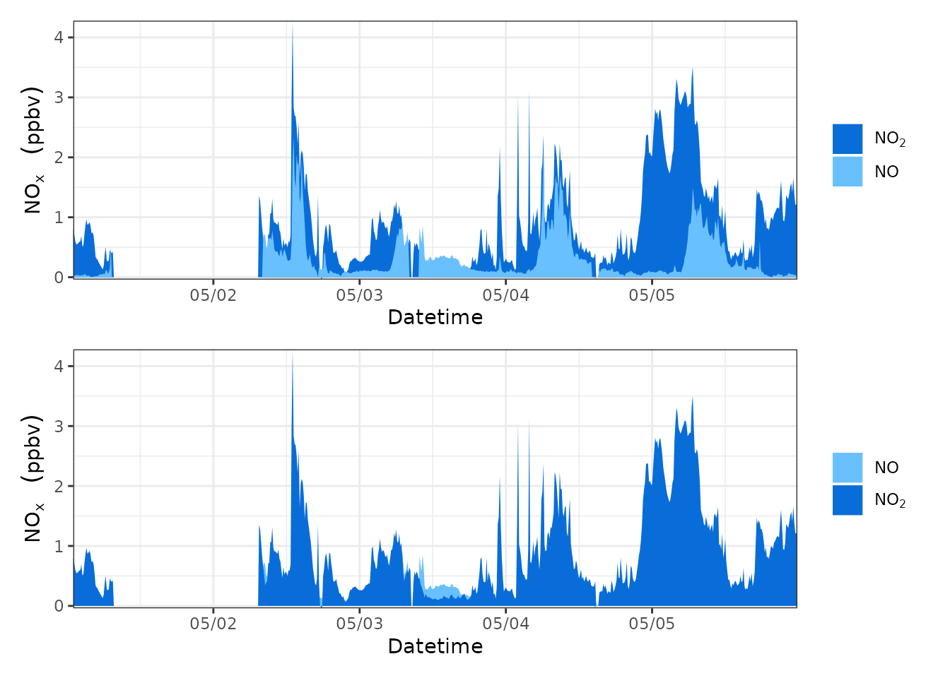 For example, in the following example, the only difference between the codes of the two plots is only that the column numbers of NO2 and NO (3 and 2, respectively) are arranged in a different order in the parameters.