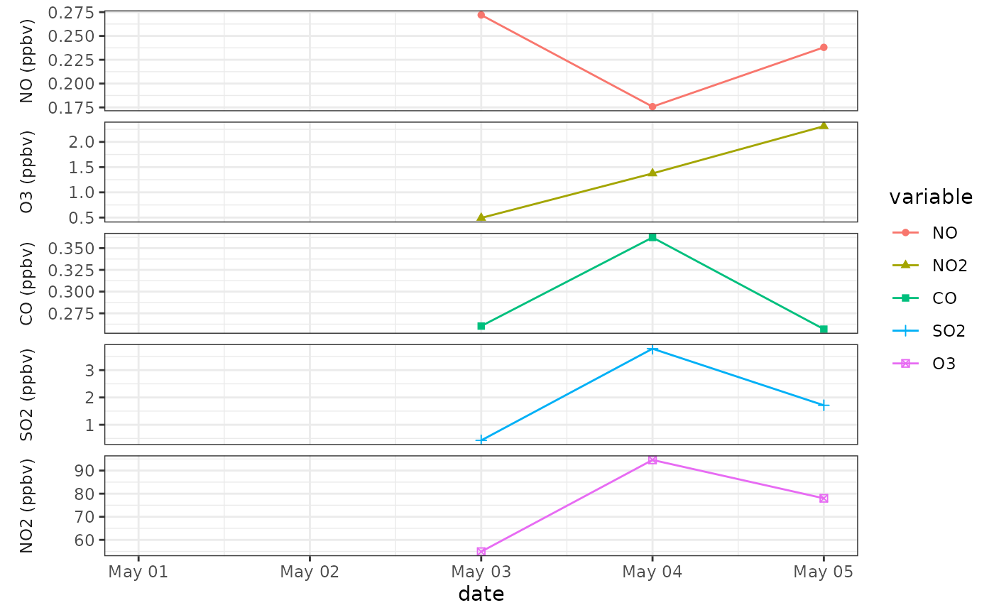 dm8n(aqi,colio=6,unitlb=c("NO (ppbv)", "NO2 (ppbv)", "CO (ppbv)", "SO2 (ppbv)", "O3 (ppbv)"))